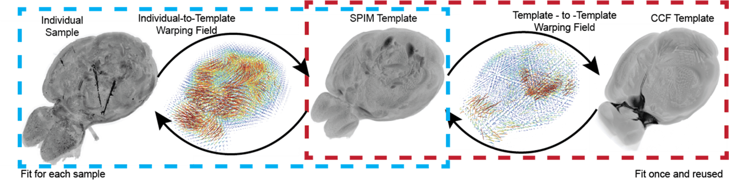 Integrating analyses between experiments requires aligning samples to a common reference space. The Allen Mouse Brain Common Coordinate Framework (CCF)1 is a 3D atlas that allows for co-registration of experimental samples and provides anatomical annotation of brain structures. Cross-modal alignment of whole-brain SPIM datasets to the CCF (originally generated via serial two-photon tomography) is achieved using an intermediate SPIM template created by averaging many cleared brains. Automated CCF registration enables robust, reproducible science and anatomically informed analyses of large experimental cohorts.