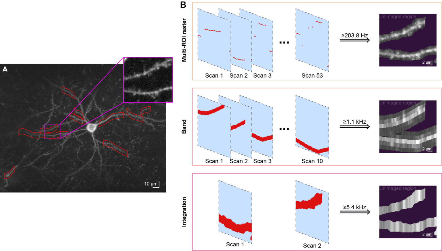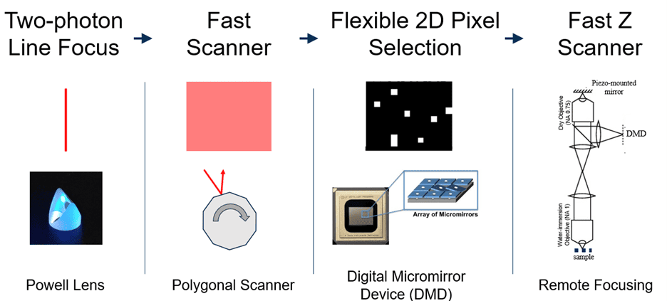 This platform uses a two-photon microscope SLAP2 that records patterns of synaptic input and output in individual neurons at hundreds to thousands of frames per second in mice performing complex behaviors, using a flexible scan system that combines a digital micromirror device (DMD) with a high-speed scanner.