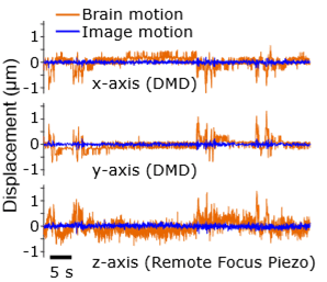 During imaging, SLAP2 tracks brain movement from the incoming image stream and corrects it in real time, with latencies under 100 microseconds. This compensates for most motion artifacts, even in head-fixed mice running on a treadmill.