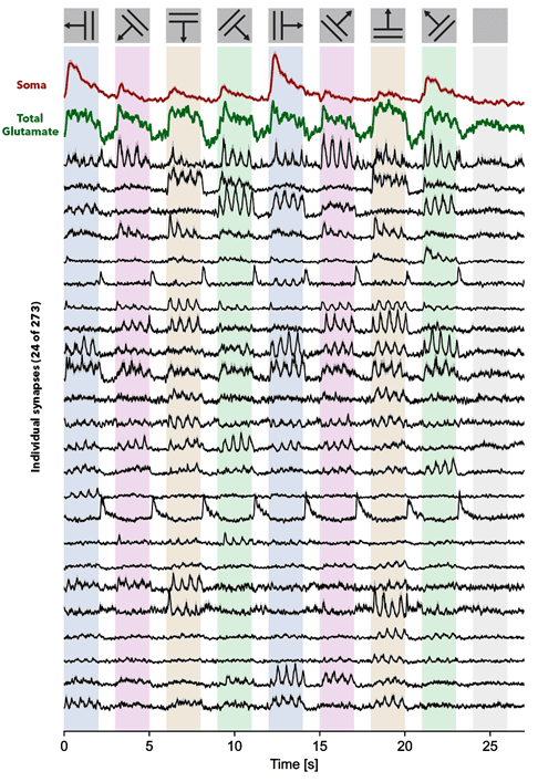 To visualize inputs to neurons, we develop fluorescent protein neurotransmitter indicators. Neurons communicate at synapses by releasing brief (~1 ms) bursts of neurotransmitter molecules, such as glutamate, GABA, or dopamine. To make these molecules visible, we engineer genetically encoded indicators that bind neurotransmitters and fluoresce. These indicators are expressed on a neuron’s surface to report its synaptic inputs.