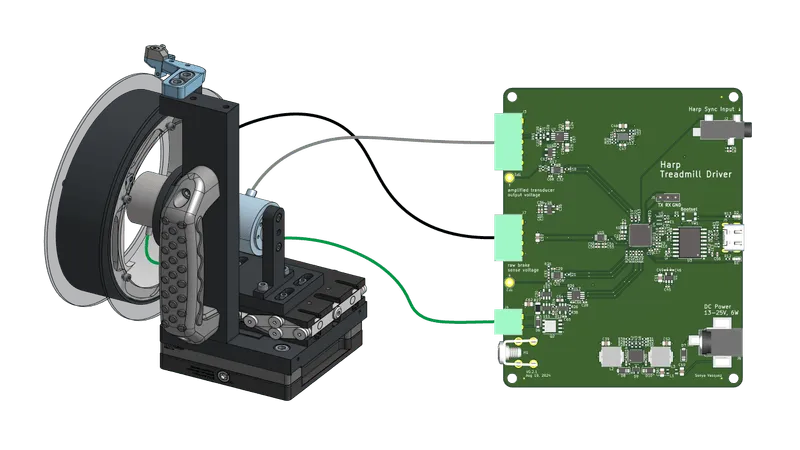 A Harp-compatible device for controlling an instrumented mouse treadmill.