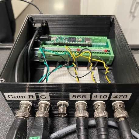 Frame-projected independent fiber photometry (FIP) is a method to measure fluorescent sensor signals through optical fibers implanted in living animals, using a camera to record video of the fiber faces. To precisely control timings of excitation and camera frame acquisition for FIP, and of other external stimulation apparatus (e.g. LEDs for photo-stimulation), we use a Teensy 4.1 microcontroller, which generates voltage pulses without relying on continuous communication with the operating system of the experimental computer for timing. This protocol is for the 3 excitation LED + 2 collection CMOS cameras design.