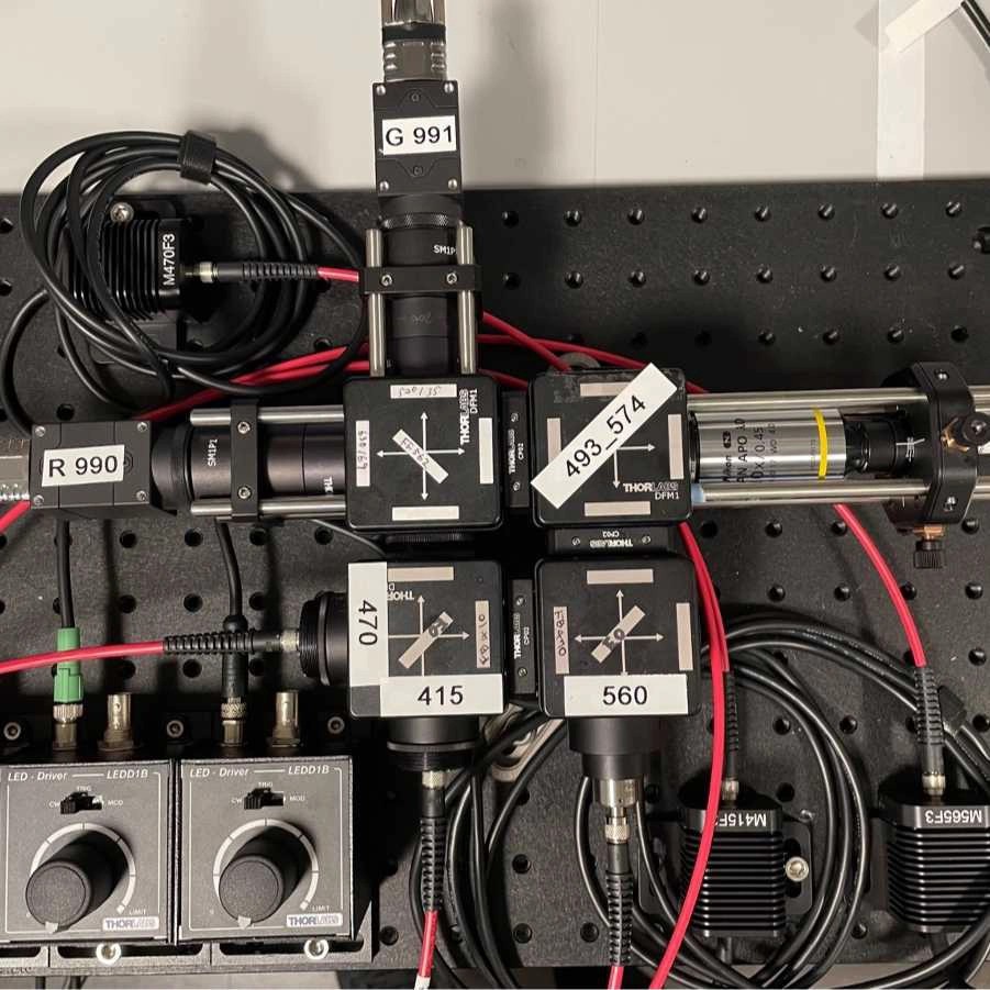 We have modified the previous design so that it can be built primarily with Thorlabs products (some products from other manufacturers are still required), which are off-the-shelf and easy to obtain with a reasonable lead time. The system described in this protocol is designed to record signals from 1) GFP-based sensors, 2) mApple-based sensors, and 3) isosbestic signals from up to 4-9 sites depending on fiber bundle selection (Fig. 1 and 2). When applied to measurements of other fluorescent protein-based sensors or spectrally shifted sensors, the selection of optical filters and/or excitation light sources should be modified accordingly. Also, the selection of the fiber patch-cable should be based on the number of simultaneously recorded sites and the diameter/NA of the fiber implants.