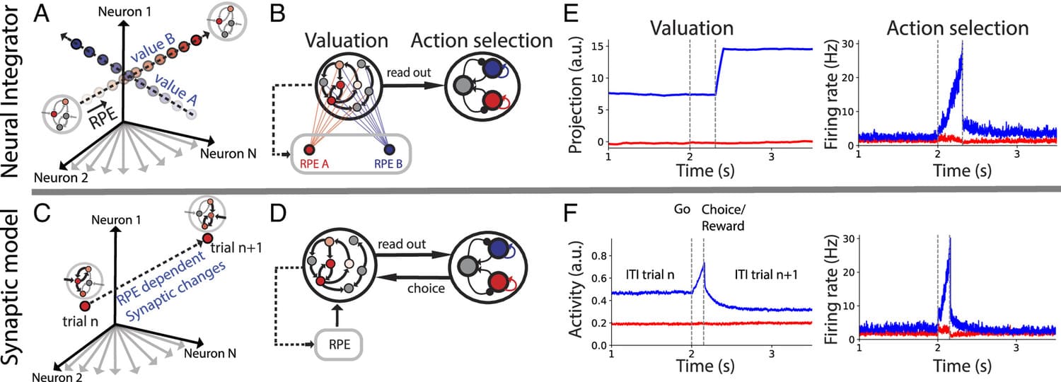During foraging behavior, action values are persistently encoded in neural activity and updated depending on the history of choice outcomes. What is the neural mechanism for action value maintenance and updating? Here, we explore two contrasting network models: synaptic learning of action value versus neural integration.
