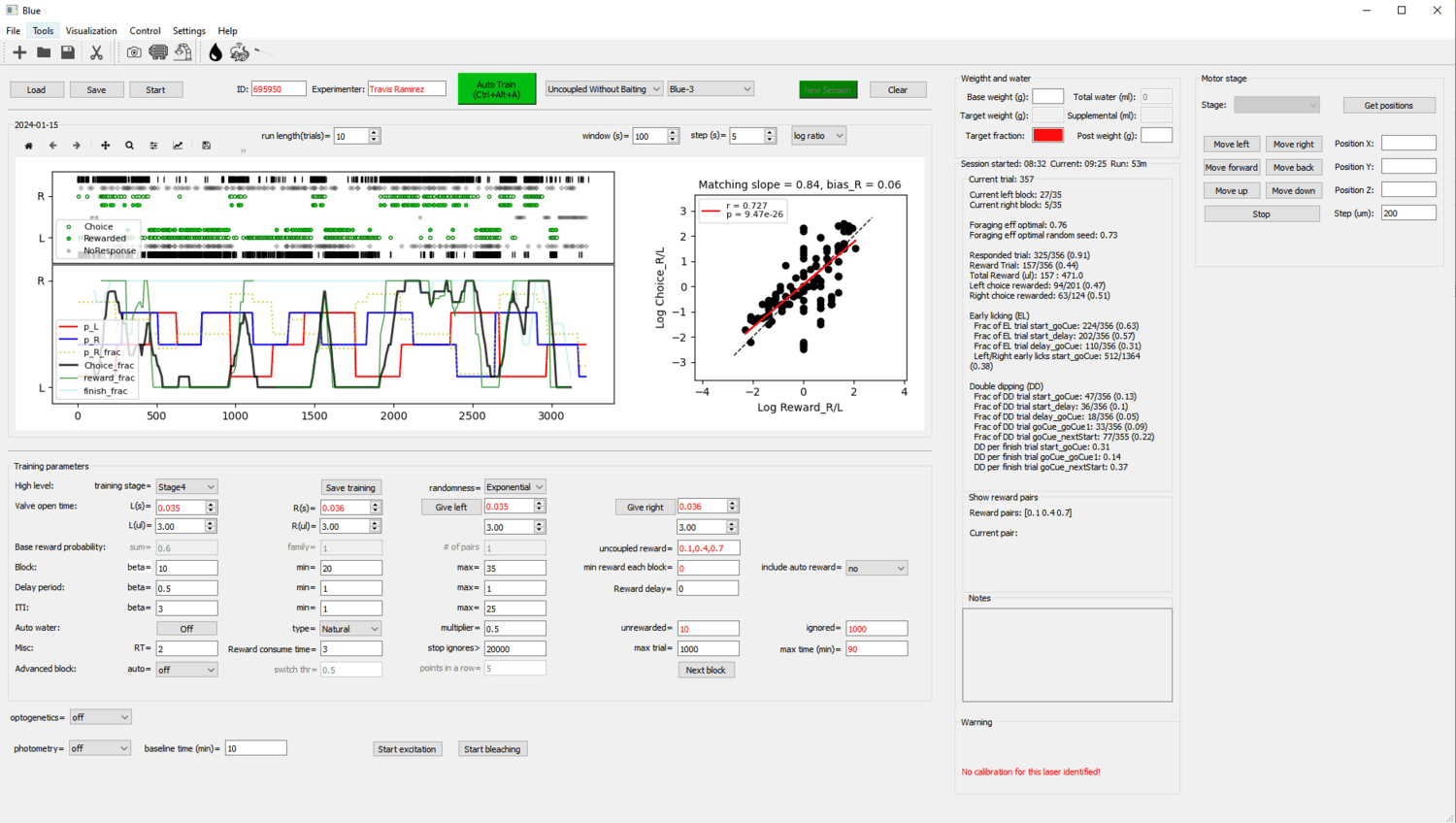 A Bonsai workflow for lick-based foraging experiments, with a PyQt frontend for visualizing performance and modifying task parameters.