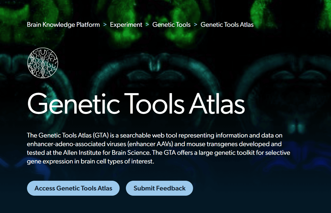 The Genetic Tools Atlas (GTA) is a searchable web tool representing information and data on enhancer-adeno-associated viruses (enhancer AAVs) and mouse transgenes developed and tested at the Allen Institute for Brain Science. The GTA offers a large genetic toolkit for selective gene expression in brain cell types of interest.