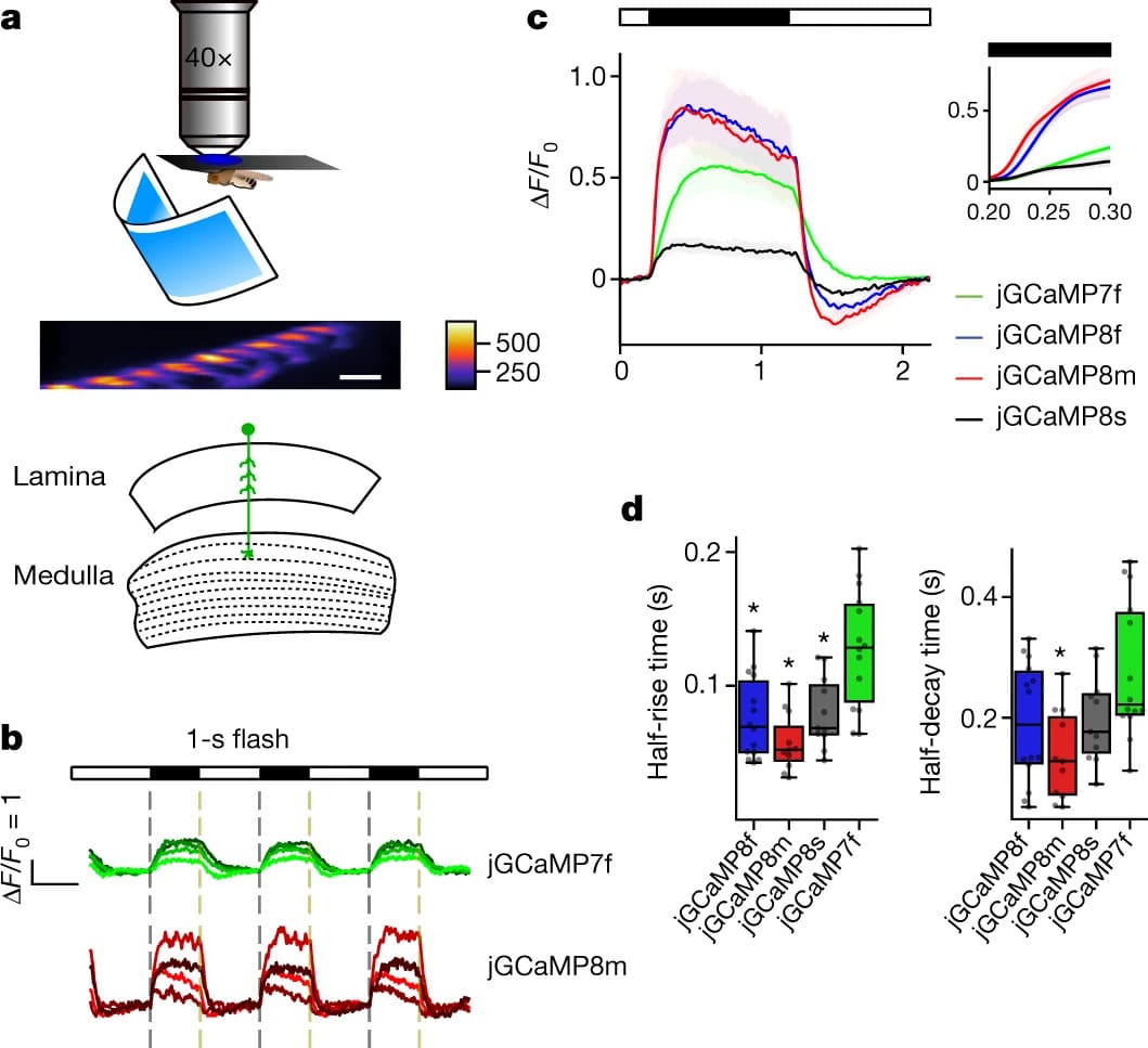Here we used large-scale screening and structure-guided mutagenesis to develop and optimize several fast and sensitive GCaMP-type indicators. jGCaMP8 sensors will allow tracking of large populations of neurons on timescales relevant to neural computation.