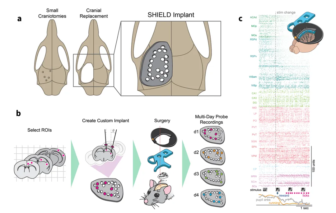 We describe a novel 3D-printed cranial-replacement implant (SHIELD) enabling electrophysiological recordings from distributed areas of the mouse brain, which allows us to measure spiking dynamics across many interacting brain regions.