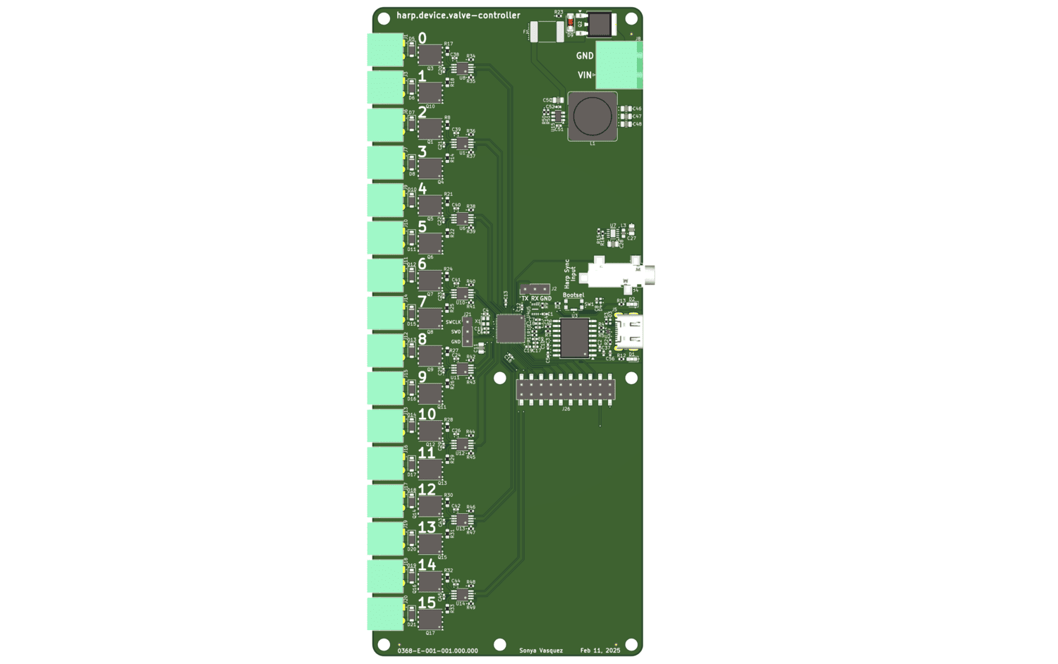 A Harp-compliant, 16-channel MOSFET Output board to control solenoid valves on closed loop with submillisecond precision.